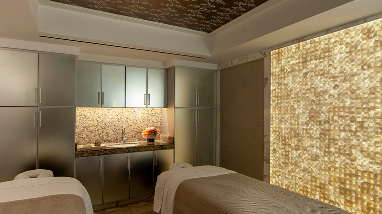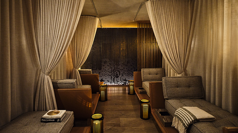 Los Angeles's second-largest hotel spa spans 14,000 square feet of Yabu Pushelberg-designed wellness facilities, anchored by a glowing Himalayan salt therapy room that purges environmental toxins. The 90-minute Sunset treatment layers massage, aromatherapy, bodywork and a LILFOX mini-facial into one comprehensive session, while Dr. Rita Rakus's first U.S. clinic delivers advanced facial rejuvenation. Guests craft their own aromatherapy crystal keepsake post-treatment, housed in a Sanjana cloth bag.