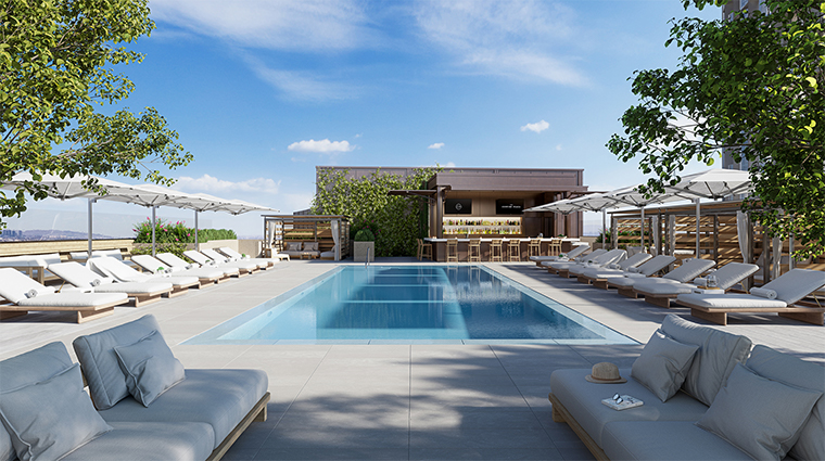 The Maybourne group's California debut channels the elegance of Claridge's through warm Art Deco interiors that honor Hollywood's golden era. Its ninth-floor rooftop delivers sweeping views to the Hollywood sign, while the blue-mosaic pool plays music underwater. The intimate Whisky Bar pours rare Macallan scotch alongside refined spa treatments and Uma Ayurveda rituals—classically indulgent, quintessentially Beverly Hills.
