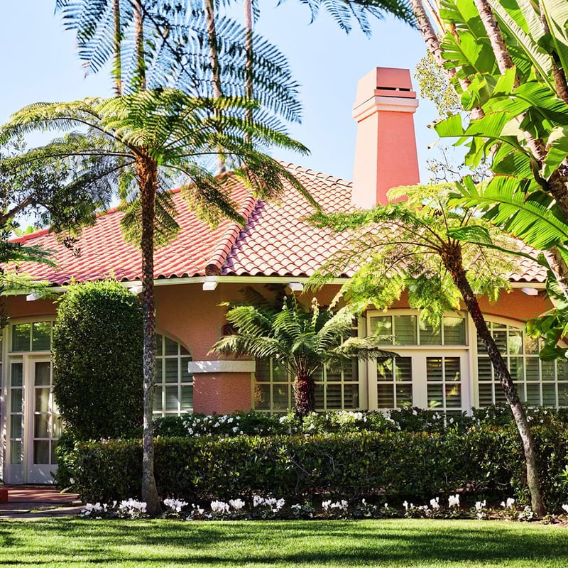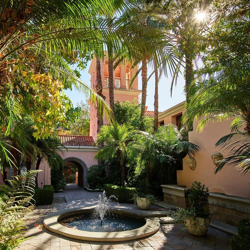 Rose-colored Mediterranean bungalows scatter across eighteen secluded acres where Elizabeth Taylor once honeymooned and Marilyn Monroe kept her favorite rooms. Guests cross an arched stone bridge past Swan Lake to reach this Hollywood sanctuary, its gardens fragrant with two hundred plant species and the sound of hummingbirds. The restaurant terrace features heated terracotta floors and famous lemon pancakes, while the spa offers mosaic steam rooms for complete retreat.