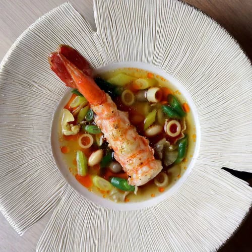 Chef Aitor Zabala's three-Michelin-starred Somni—Catalan for "dream"—delivers Spanish-inflected Californian cuisine through a procession of meticulously crafted small bites. The shiso tartare tempura and mussel escabeche showcase bold flavors and textural precision, served in a serene dining room marked by creamy tones, light wood, and a striking bull's head sculpture. For serious gastronomes seeking LA's most inventive tasting menu.