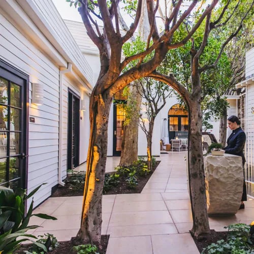 The century-old Fairmont Miramar occupies five Pacific-facing acres in Santa Monica, anchored by a towering fig tree and 31 freestanding bungalows scattered through lush gardens—the city's most sought-after accommodations. A shuttle ferries guests to the private beach club, while on-site diversions include the eight-seat Soko sushi counter in the lobby, where chef Masa Shimakawa plates omakase with sake pairings, FIG's legendary happy hour, and Exhale Spa's Turkish bath and signature facial massages.