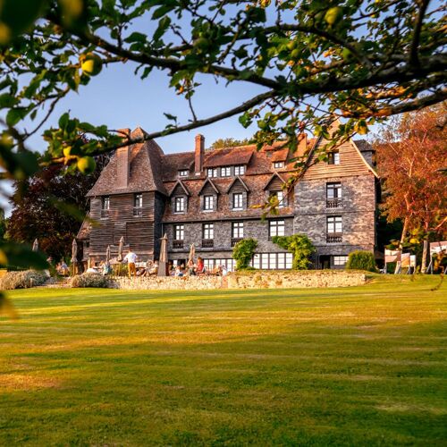 This 17th-century manor in Pennedepie overlooks the Normandy coast, its turreted façade and antique dinner bell framing a contemporary interior by Roche Bobois across 27 rooms with vaulted ceilings and exposed beams. The Garancia Spa — France's only — offers hammam, sauna, and heated outdoor pool. Lilian Douchet, former Top Chef contestant, leads Restaurant Capucine with Gault & Millau-recognized locavore menus. Minutes from Honfleur's port, it suits travelers seeking coastal calm with refined dining.