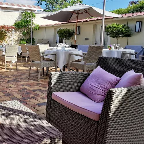 A flower-filled courtyard terrace sets the scene at this Chevreuse address, where chef Laurent Gasnier draws on formative years at Le Bristol, George V, and alongside the Troisgros family. His cooking favors impeccably sourced, mature produce—vegetables and fish treated with precision. Expect dishes like courgette ball with organic Brousse and basil pistou, or sea bass lifted by coconut and young broad beans.