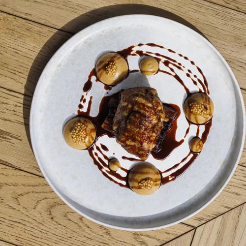 A nineteenth-century farmhouse just outside Versailles, La Ferme de Voisins welcomes diners through a flower-filled courtyard that doubles as a summer terrace. The focused menu balances house classics—most notably an irreplaceable preparation of calf's head—with inventive seasonal plates. Meals conclude with the signature rum and orange punch baba, a fitting finale to an unhurried countryside lunch.