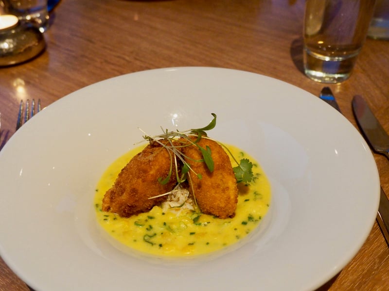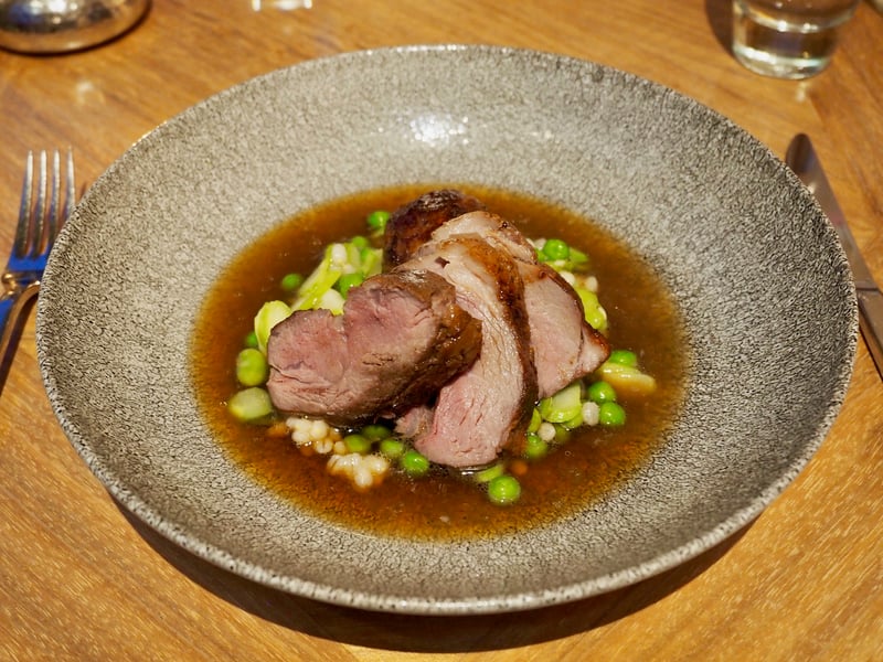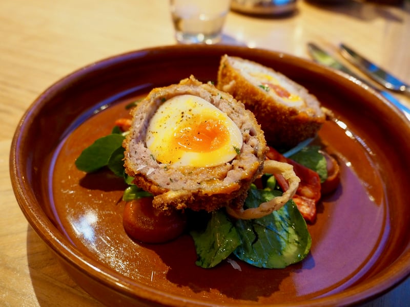 All of the classics of British cuisine are on the menu: we can hardly resist the scotch eggs (which catch my eye every time I pass through Fortnum & Mason in London) and the crab cakes, and enjoy them as appetizers. Next up is the delicious lamb, cooked to a perfect pink color. It's light and flavorful, ideal for our dinner! The meal is accompanied by a good bottle of wine, and our happiness is nearly complete…